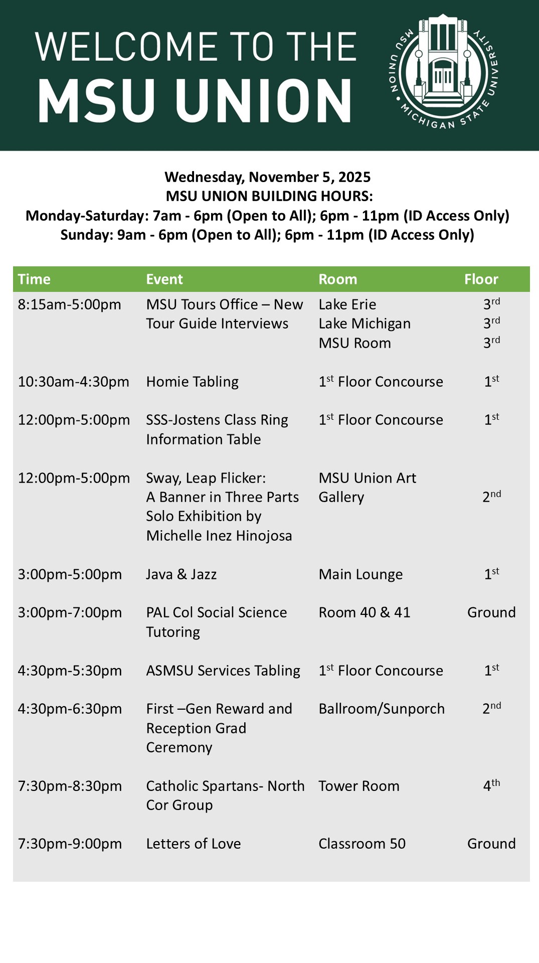 By spitzka, Fri, 10/31/2025 - 15:03 Creator: spitzka Area: MSU Union (Temp Schedule) Type: Academic Title: 11/5/2025 Subheader: Body Copy: Active Dates: Wed, 11/05/2025 - 05:00 - Wed, 11/05/2025 - 23:59 Preview