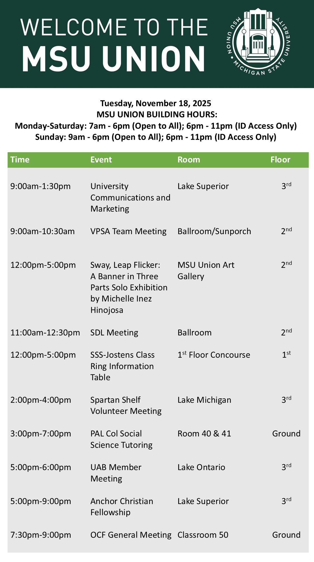 By spitzka, Mon, 11/17/2025 - 13:32 Creator: spitzka Area: MSU Union (Temp Schedule) Type: Academic Title: 11/18/2025 Subheader: Body Copy: Active Dates: Tue, 11/18/2025 - 05:00 - Tue, 11/18/2025 - 23:59 Preview
