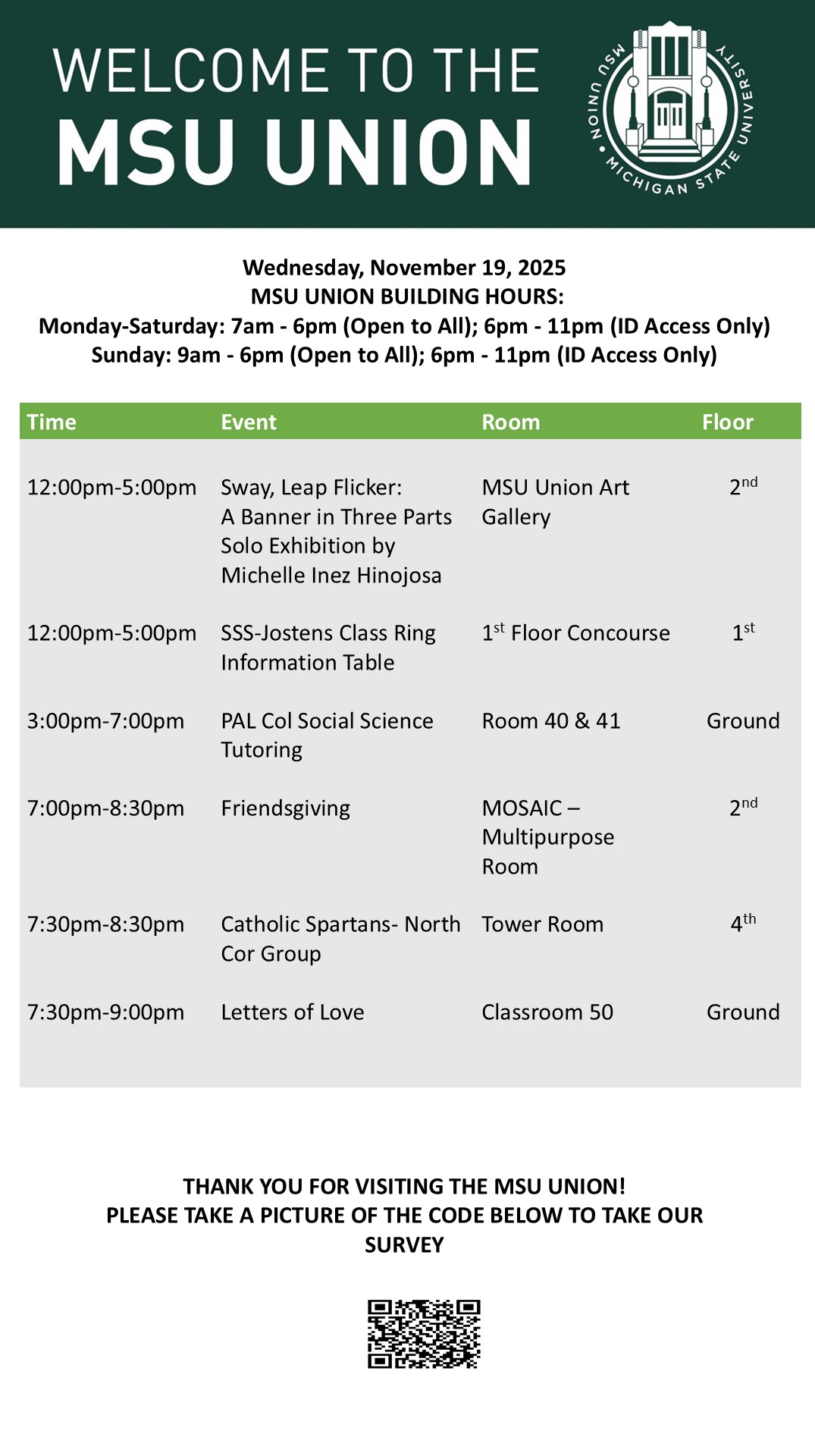 By spitzka, Mon, 11/17/2025 - 13:32 Creator: spitzka Area: MSU Union (Temp Schedule) Type: Academic Title: 11/19/2025 Subheader: Body Copy: Active Dates: Wed, 11/19/2025 - 05:00 - Wed, 11/19/2025 - 23:59 Preview