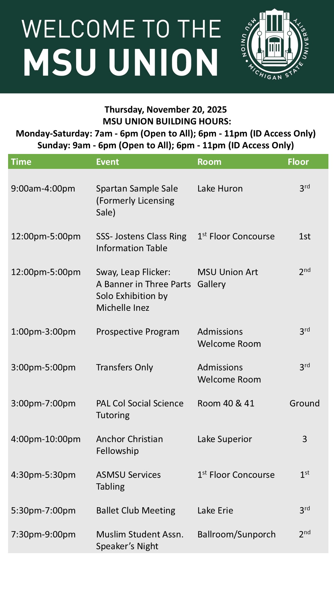 By spitzka, Mon, 11/17/2025 - 13:33 Creator: spitzka Area: MSU Union (Temp Schedule) Type: Academic Title: 11/20/2025 Subheader: Body Copy: Active Dates: Thu, 11/20/2025 - 05:00 - Thu, 11/20/2025 - 23:59 Preview