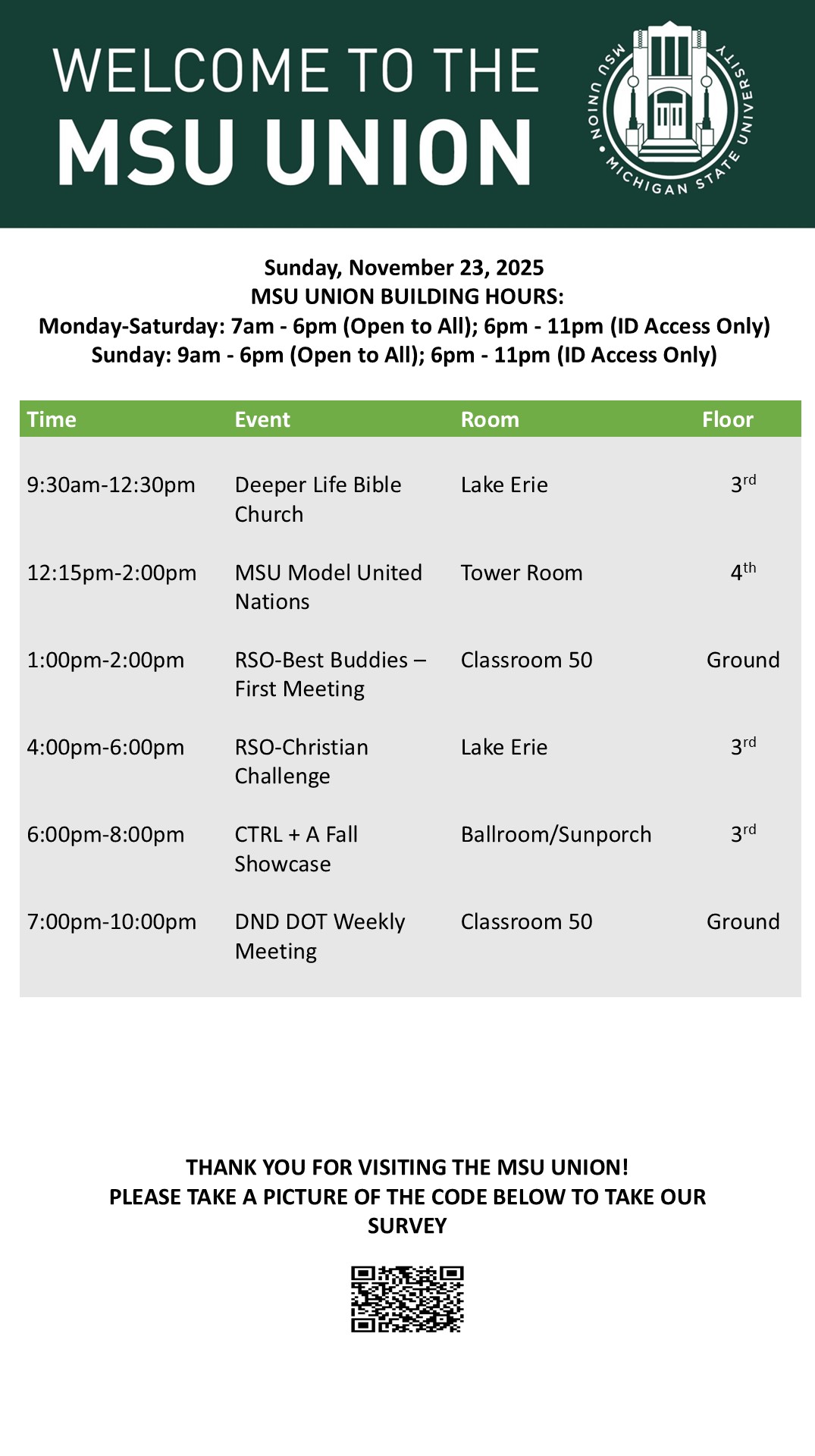 By spitzka, Mon, 11/17/2025 - 13:34 Creator: spitzka Area: MSU Union (Temp Schedule) Type: Academic Title: 11/23/2025 Subheader: Body Copy: Active Dates: Sun, 11/23/2025 - 05:00 - Sun, 11/23/2025 - 23:59 Preview