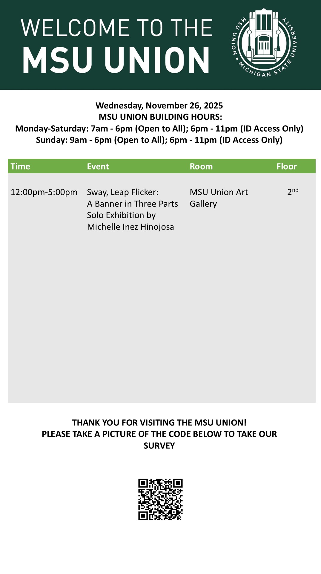 By spitzka, Fri, 11/21/2025 - 12:39 Creator: spitzka Area: MSU Union (Temp Schedule) Type: Academic Title: 11.26.25 Subheader: Body Copy: Active Dates: Wed, 11/26/2025 - 05:00 - Wed, 11/26/2025 - 23:59 Preview