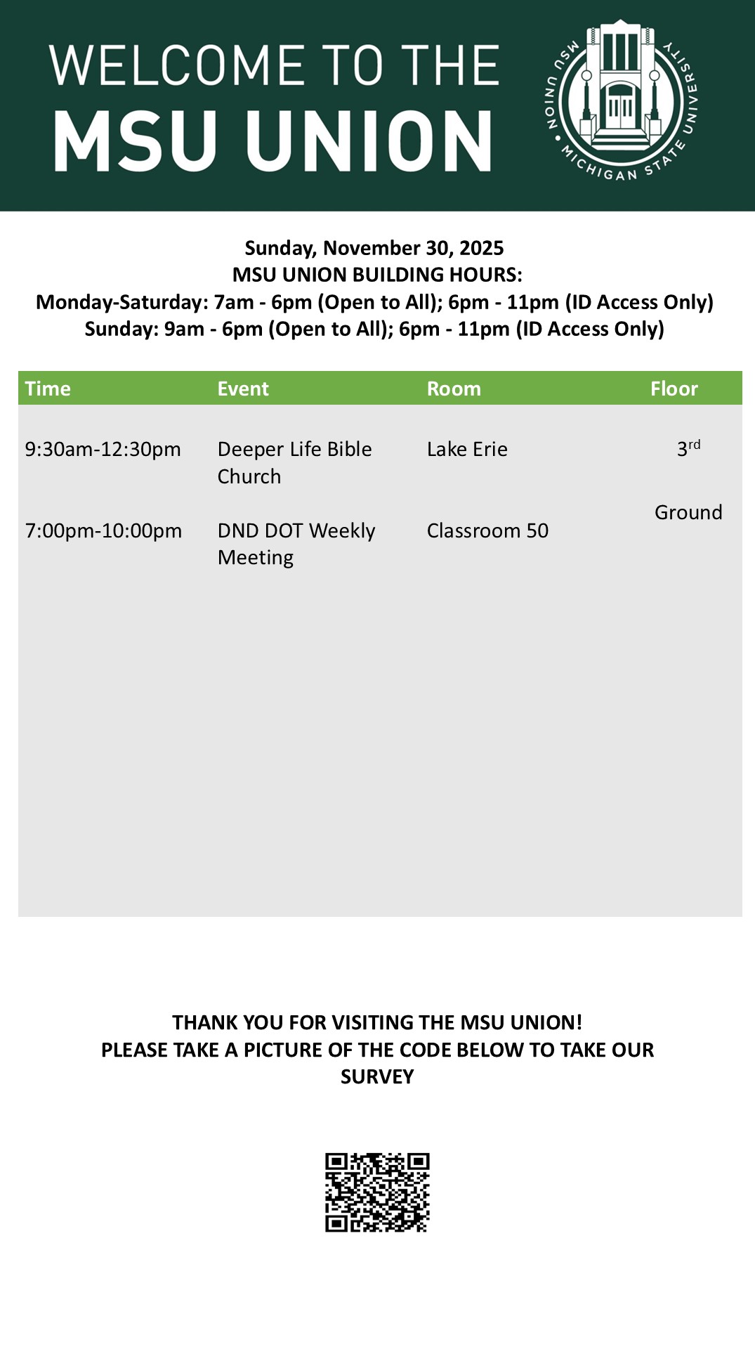 By spitzka, Fri, 11/21/2025 - 12:49 Creator: spitzka Area: MSU Union (Temp Schedule) Type: Academic Title: 11/30/2025 Subheader: Body Copy: Active Dates: Sun, 11/30/2025 - 05:00 - Sun, 11/30/2025 - 23:59 Preview