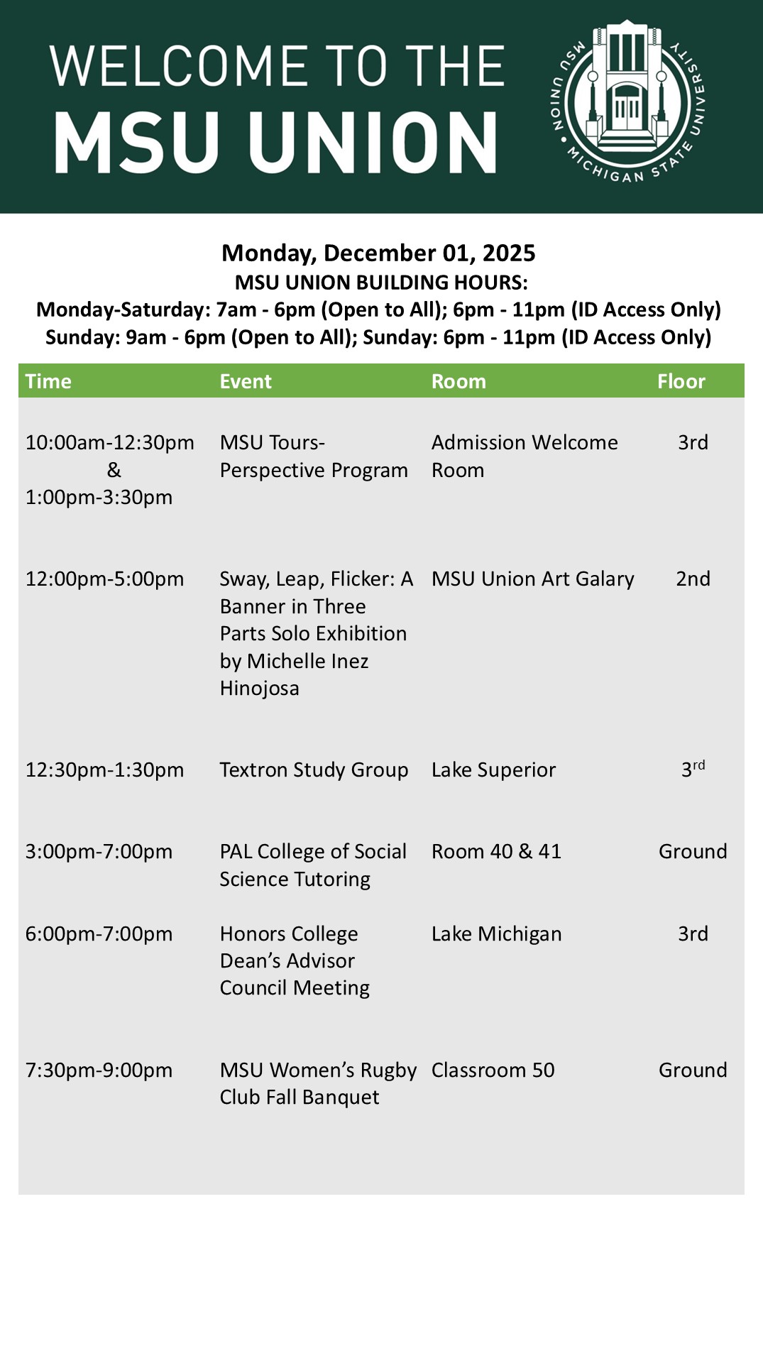 By cosme, Mon, 12/01/2025 - 10:18 Creator: cosme Area: MSU Union (Temp Schedule) Type: Academic Title: 12/01/25 Subheader: Body Copy: Active Dates: Mon, 12/01/2025 - 04:30 - Mon, 12/01/2025 - 23:59 Preview