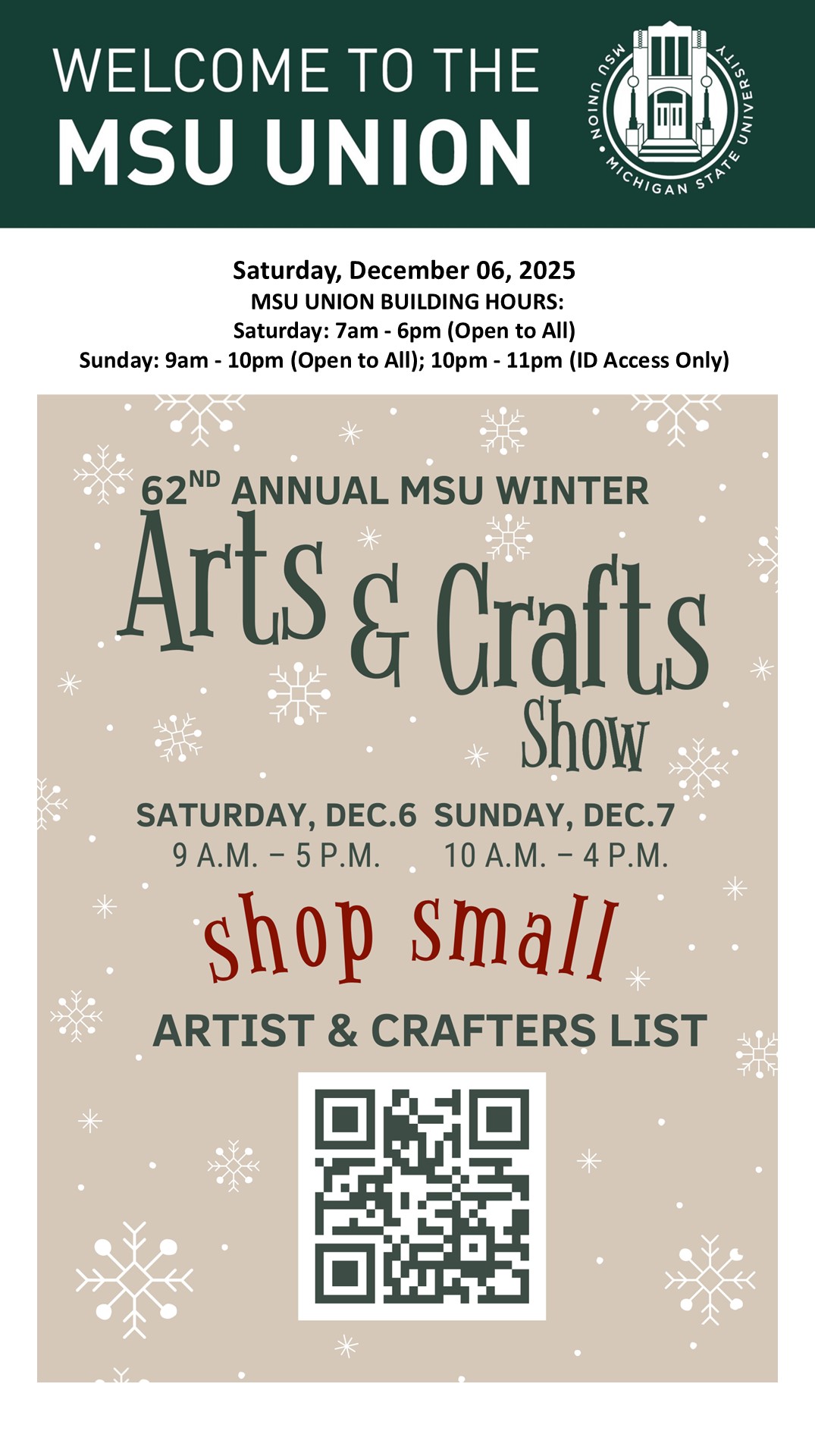 By cosme, Wed, 12/03/2025 - 14:09 Creator: cosme Area: MSU Union (Temp Schedule) Type: Academic Title: 12/06/25 Subheader: Body Copy: Active Dates: Sat, 12/06/2025 - 04:30 - Sat, 12/06/2025 - 23:59 Preview
