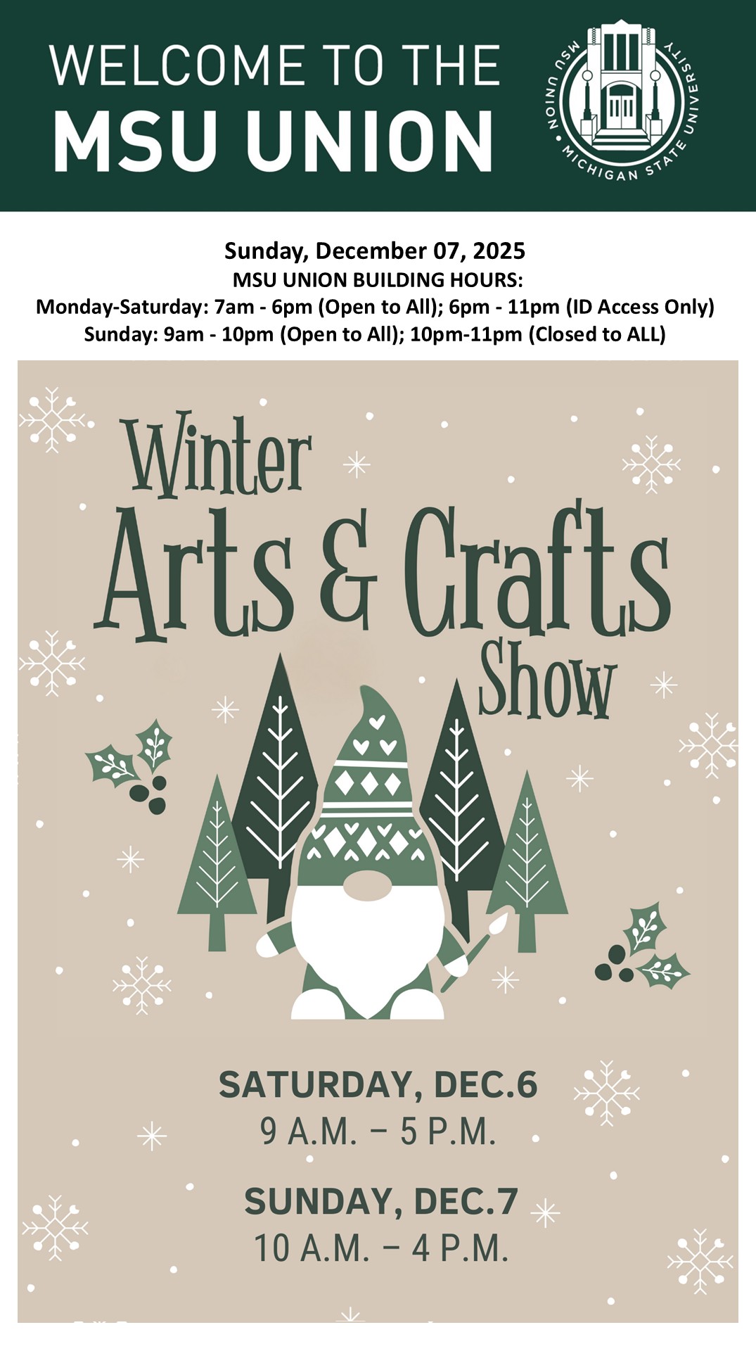 By nigroeli, Thu, 12/04/2025 - 17:42 Creator: nigroeli Area: MSU Union (Temp Schedule) Type: Academic Title: 12/7/25 2 Subheader: Body Copy: Active Dates: Sun, 12/07/2025 - 04:30 - Sun, 12/07/2025 - 23:59 Preview