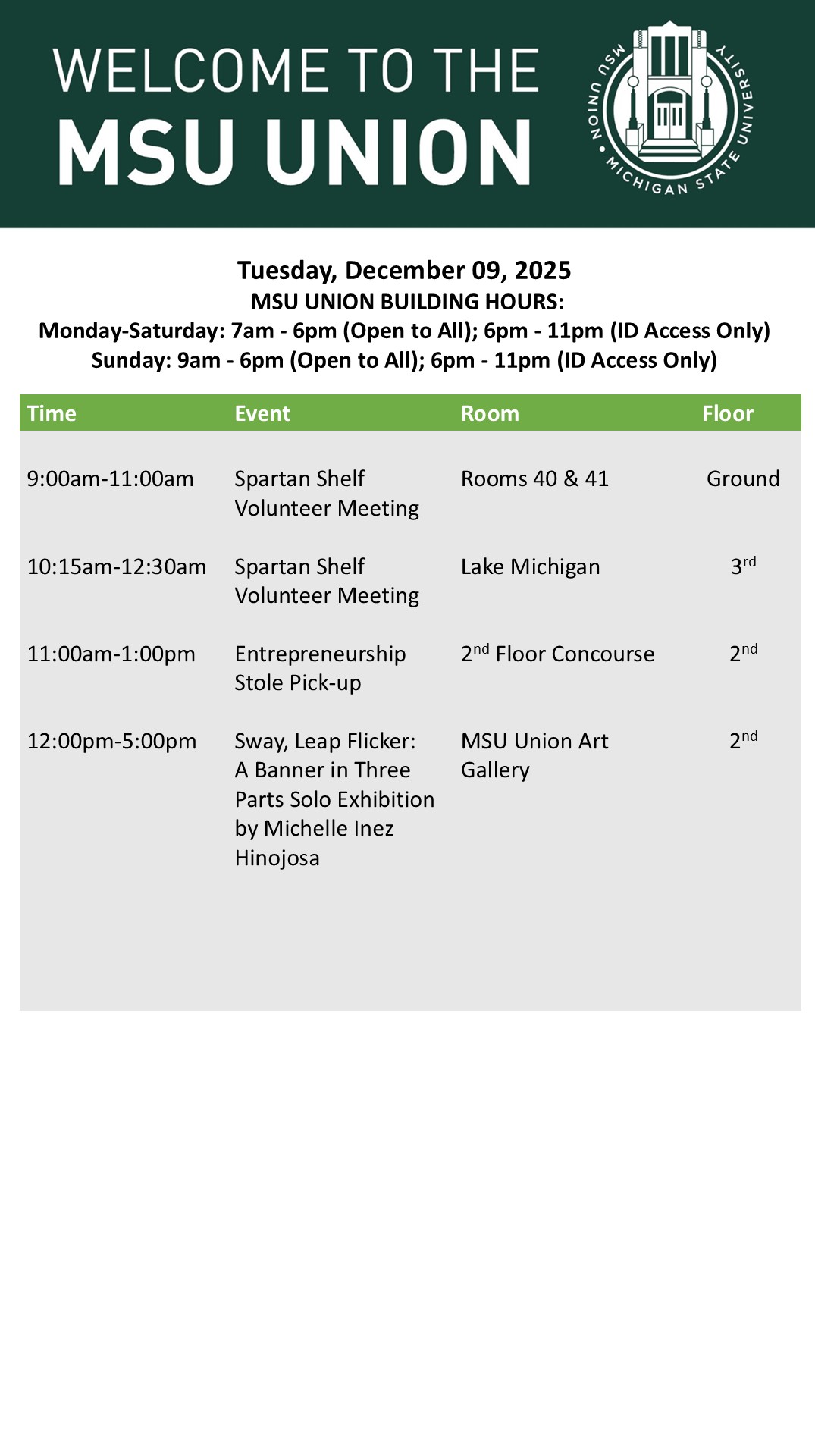 By cosme, Mon, 12/08/2025 - 14:21 Creator: cosme Area: MSU Union (Temp Schedule) Type: Academic Title: 12/09/25 Subheader: Body Copy: Active Dates: Tue, 12/09/2025 - 04:30 - Tue, 12/09/2025 - 23:59 Preview