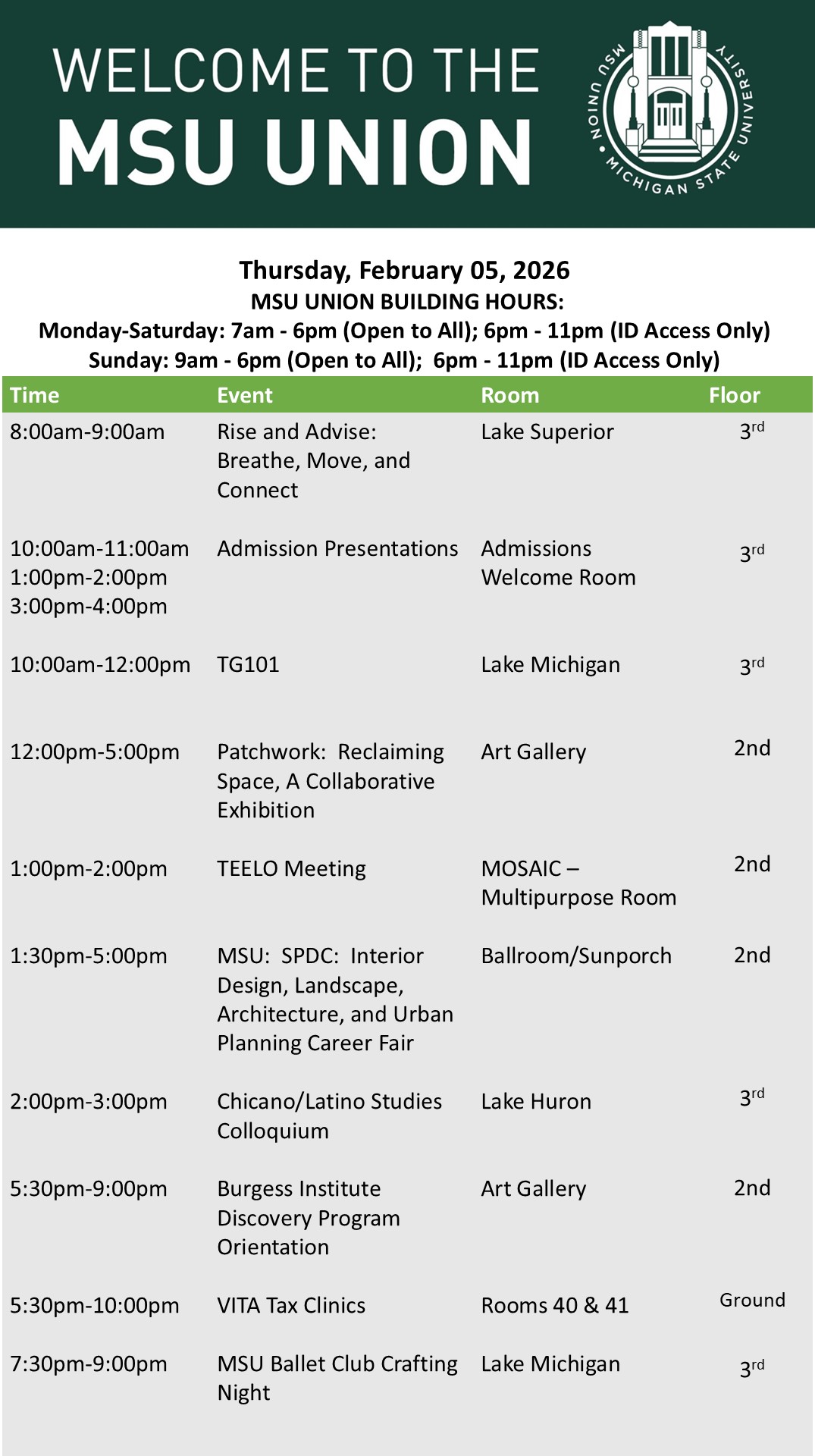 By cosme, Mon, 02/02/2026 - 14:00 Creator: cosme Area: MSU Union (Temp Schedule) Type: Academic Title: 02/05/2026 Subheader: Body Copy: Active Dates: Thu, 02/05/2026 - 04:30 - Thu, 02/05/2026 - 23:59 Preview