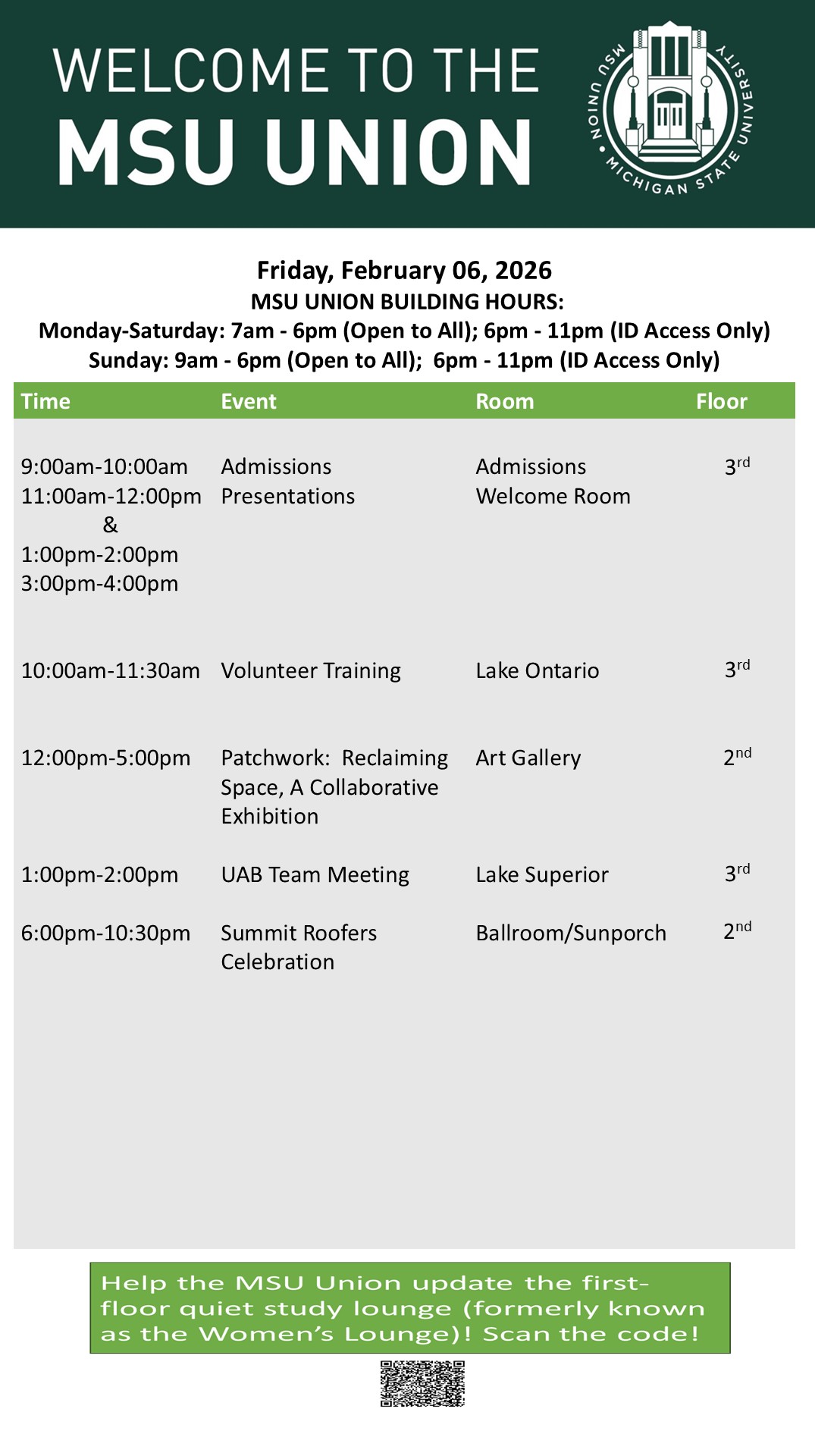 By cosme, Mon, 02/02/2026 - 14:11 Creator: cosme Area: MSU Union (Temp Schedule) Type: Academic Title: 02/06/26 Subheader: Body Copy: Active Dates: Fri, 02/06/2026 - 04:30 - Fri, 02/06/2026 - 23:59 Preview