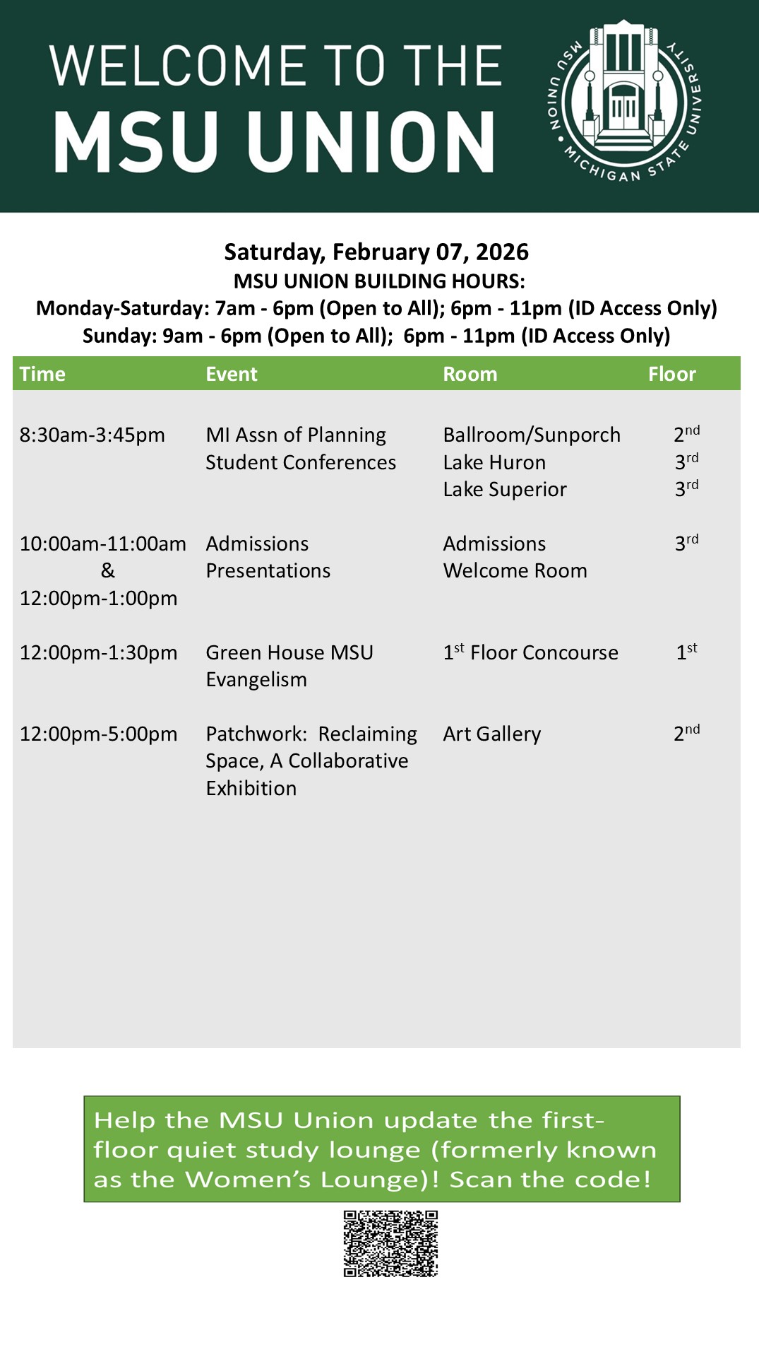 By cosme, Mon, 02/02/2026 - 14:19 Creator: cosme Area: MSU Union (Temp Schedule) Type: Academic Title: 02/07/26 Subheader: Body Copy: Active Dates: Sat, 02/07/2026 - 04:30 - Sat, 02/07/2026 - 23:59 Preview