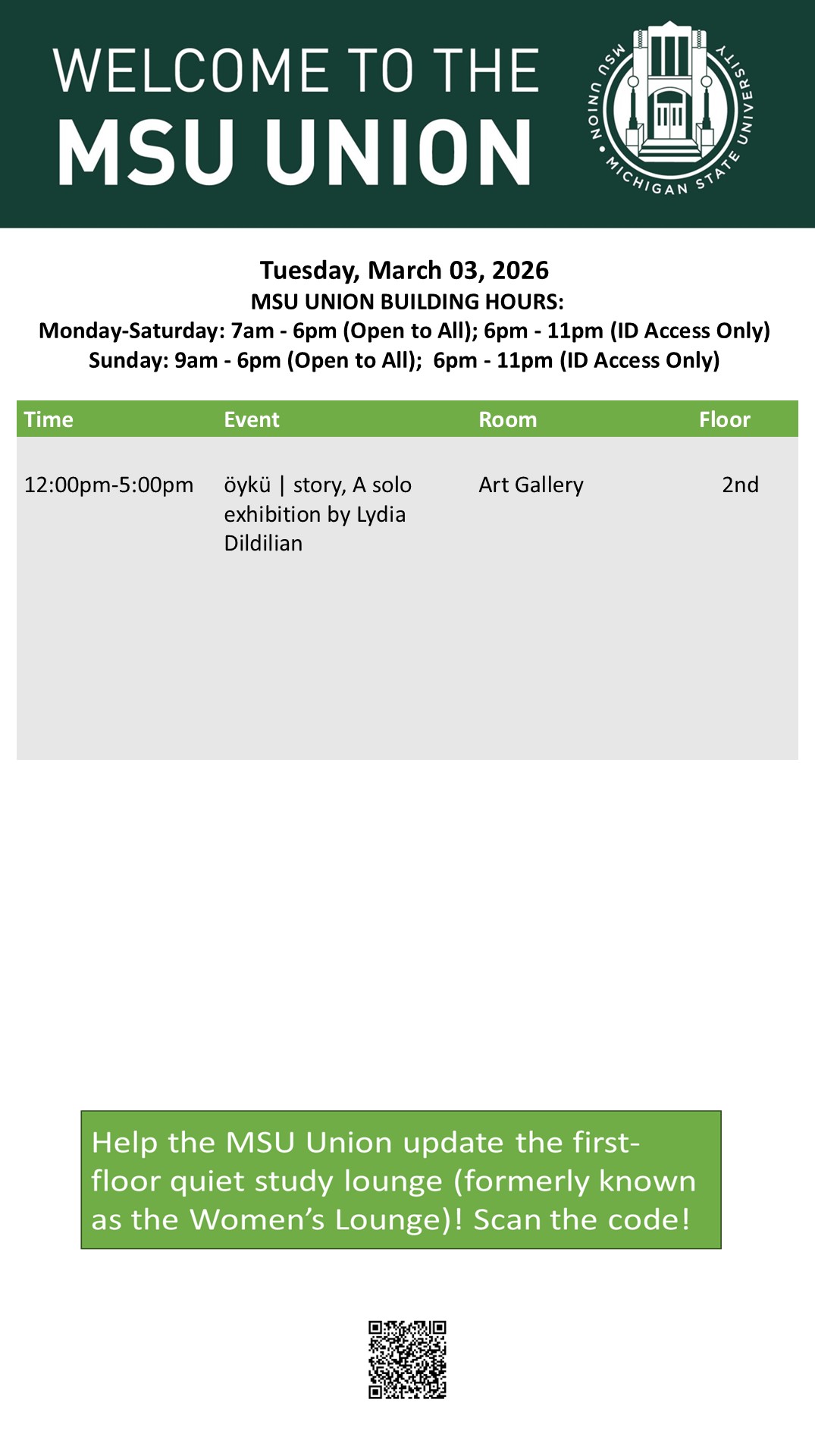 By feldp100, Thu, 02/26/2026 - 15:13 Creator: feldp100 Area: MSU Union (Temp Schedule) Type: Academic Title: 03-03-26 Subheader: Body Copy: Active Dates: Tue, 03/03/2026 - 04:30 - Tue, 03/03/2026 - 23:59 Preview