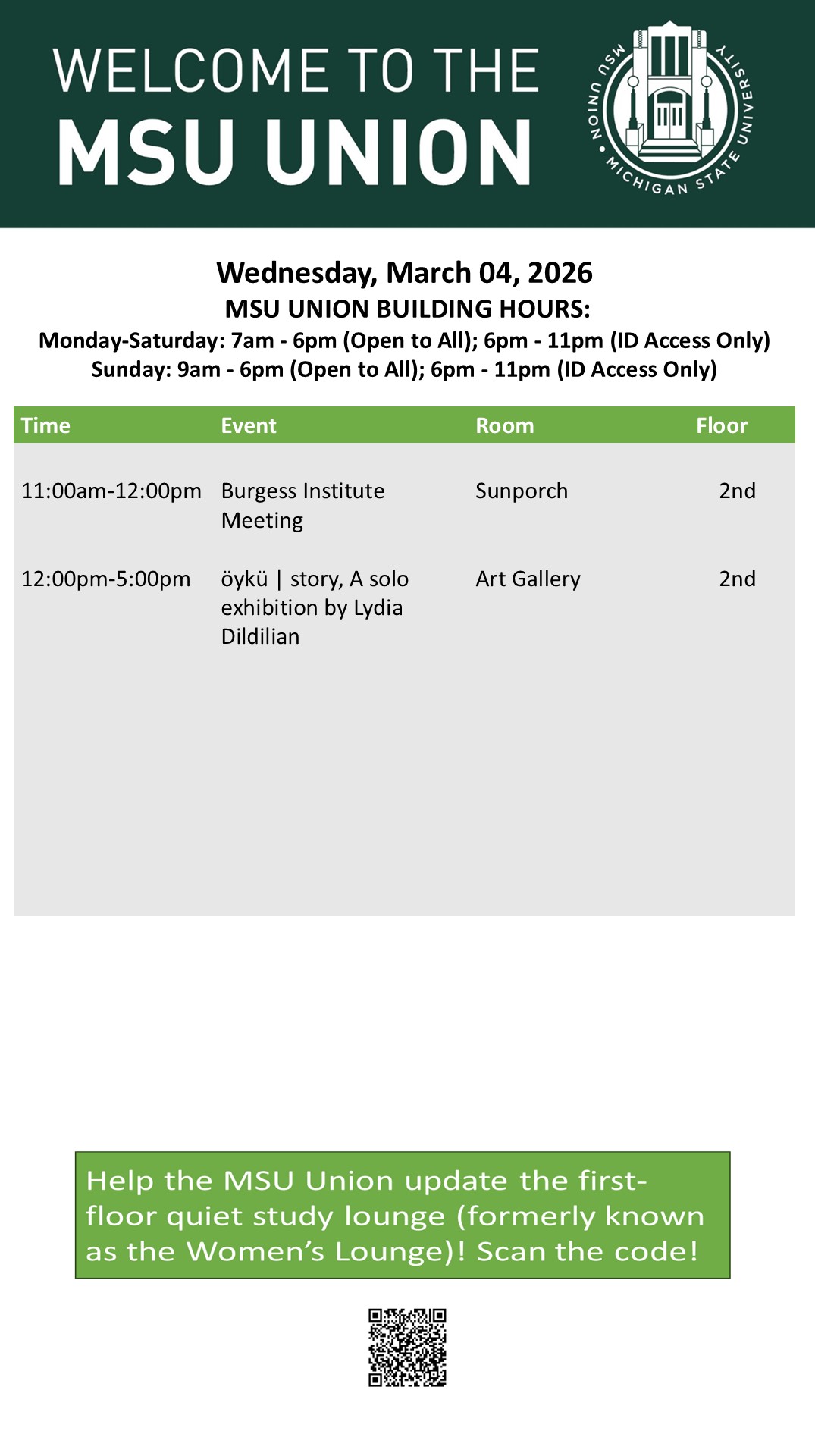 By feldp100, Thu, 02/26/2026 - 15:14 Creator: feldp100 Area: MSU Union (Temp Schedule) Type: Academic Title: 03-04-26 Subheader: Body Copy: Active Dates: Wed, 03/04/2026 - 04:30 - Wed, 03/04/2026 - 23:59 Preview