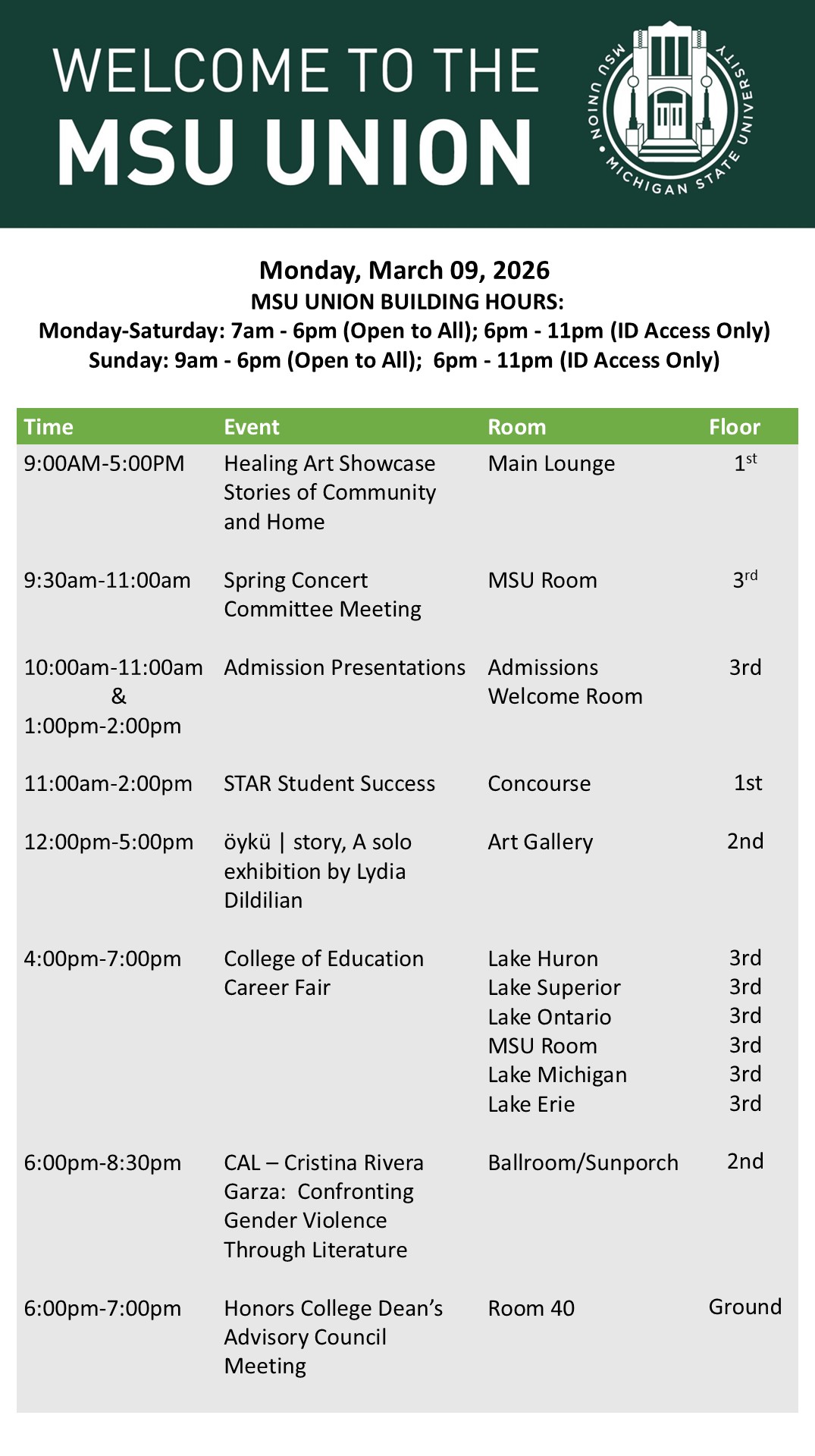 By cosme, Thu, 03/05/2026 - 16:54 Creator: cosme Area: MSU Union (Temp Schedule) Type: Academic Title: 03/09/26 Subheader: Body Copy: Active Dates: Mon, 03/09/2026 - 04:30 - Mon, 03/09/2026 - 23:59 Preview
