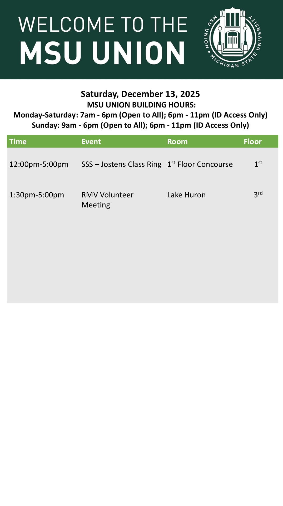 By cosme, Thu, 12/11/2025 - 14:19 Creator: cosme Area: MSU Union (Temp Schedule) Type: Academic Title: 12/13/25 Subheader: Body Copy: Active Dates: Sat, 12/13/2025 - 04:30 - Sat, 12/13/2025 - 23:59 Preview