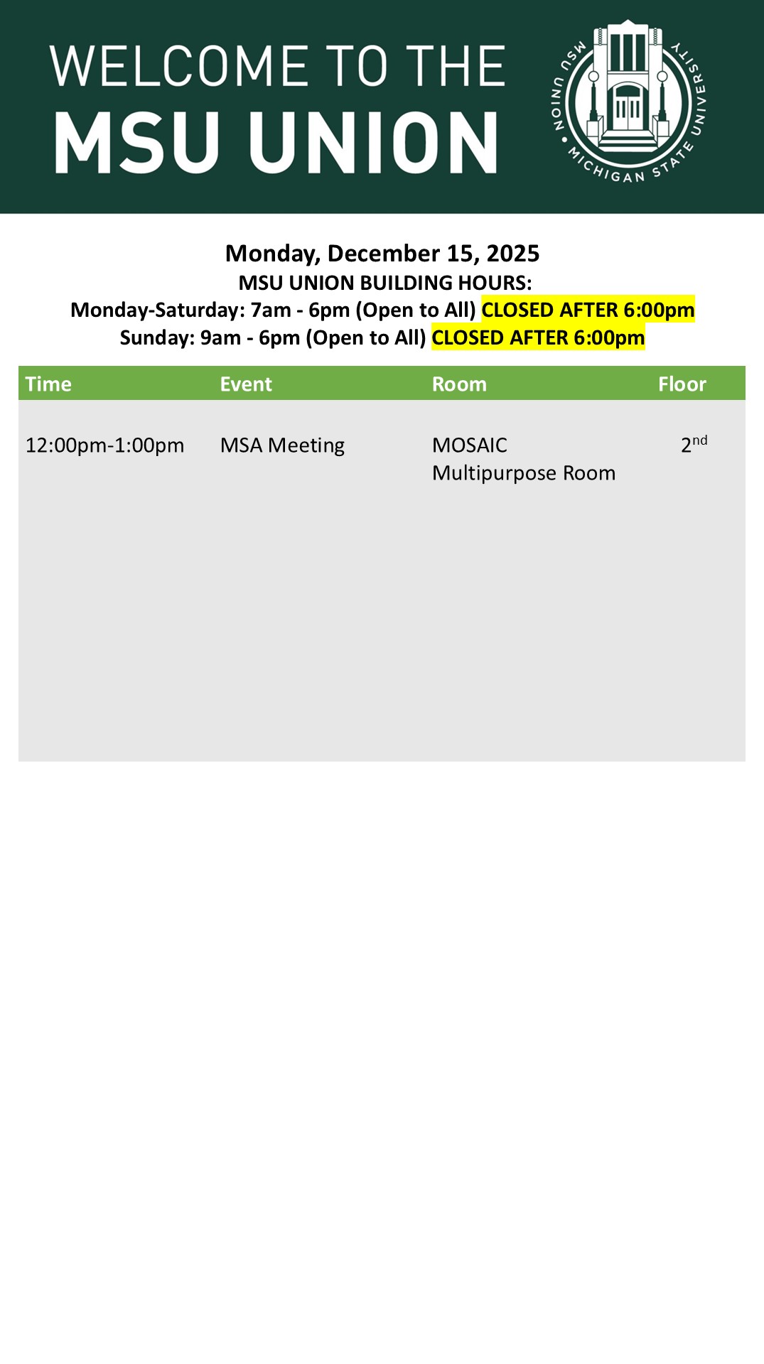 By cosme, Thu, 12/11/2025 - 15:40 Creator: cosme Area: MSU Union (Temp Schedule) Type: Academic Title: 12/15/25 Subheader: Body Copy: Active Dates: Mon, 12/15/2025 - 02:30 - Mon, 12/15/2025 - 23:59 Preview