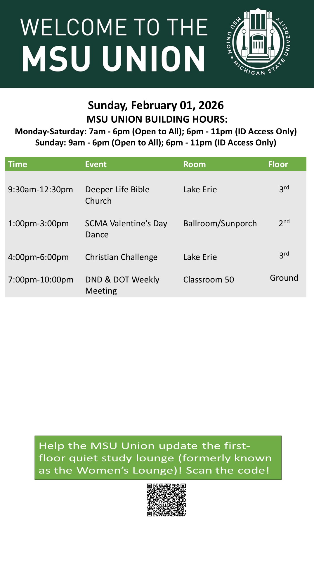 By cosme, Mon, 01/26/2026 - 15:31 Creator: cosme Area: MSU Union (Temp Schedule) Type: Academic Title: 02/01/2026 Subheader: Body Copy: Active Dates: Sun, 02/01/2026 - 04:30 - Sun, 02/01/2026 - 23:59 Preview