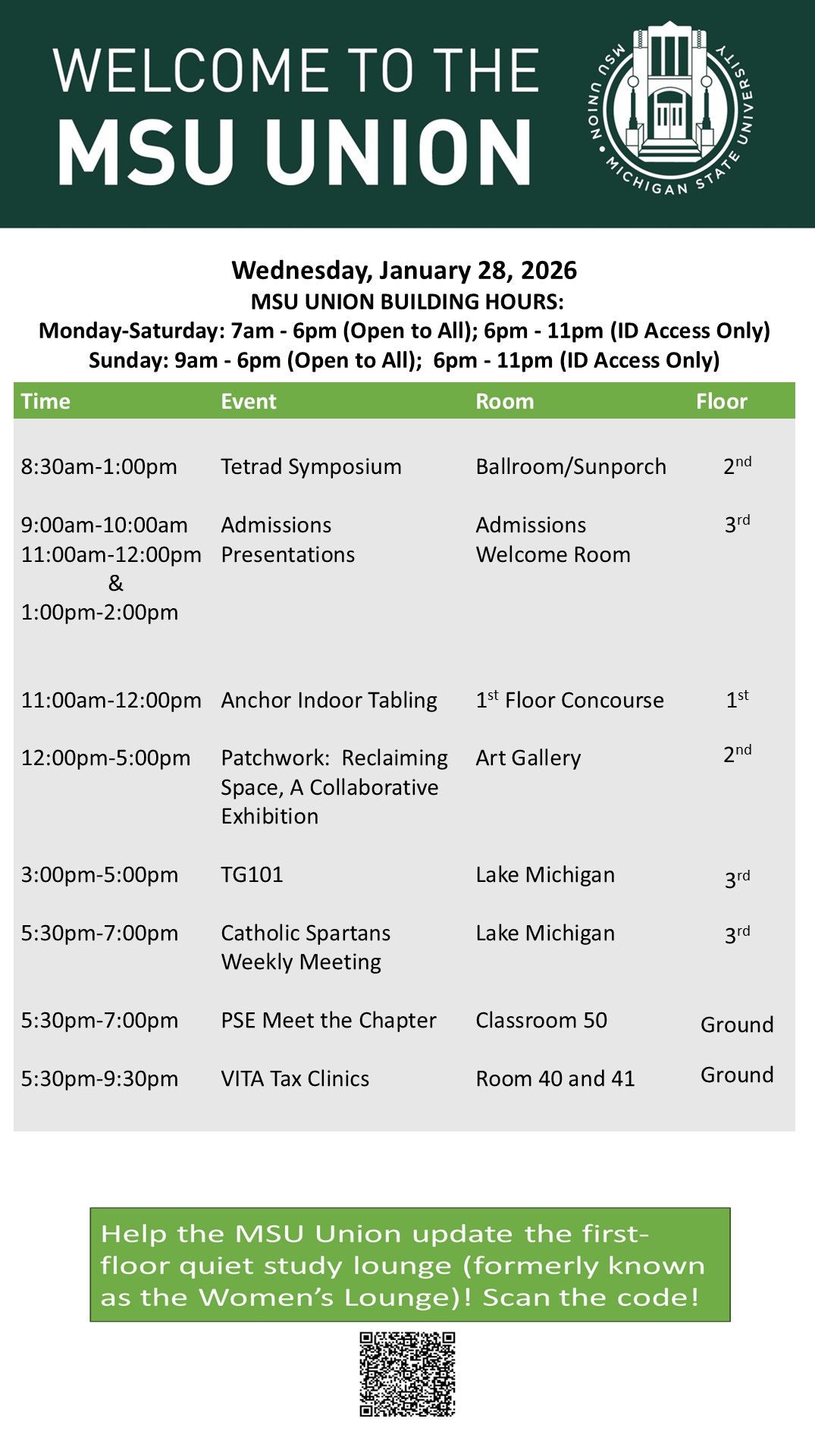 By cosme, Mon, 01/26/2026 - 16:36 Creator: cosme Area: MSU Union (Temp Schedule) Type: Academic Title: 01/28/2026 Subheader: Body Copy: Active Dates: Wed, 01/28/2026 - 04:30 - Wed, 01/28/2026 - 23:59 Preview