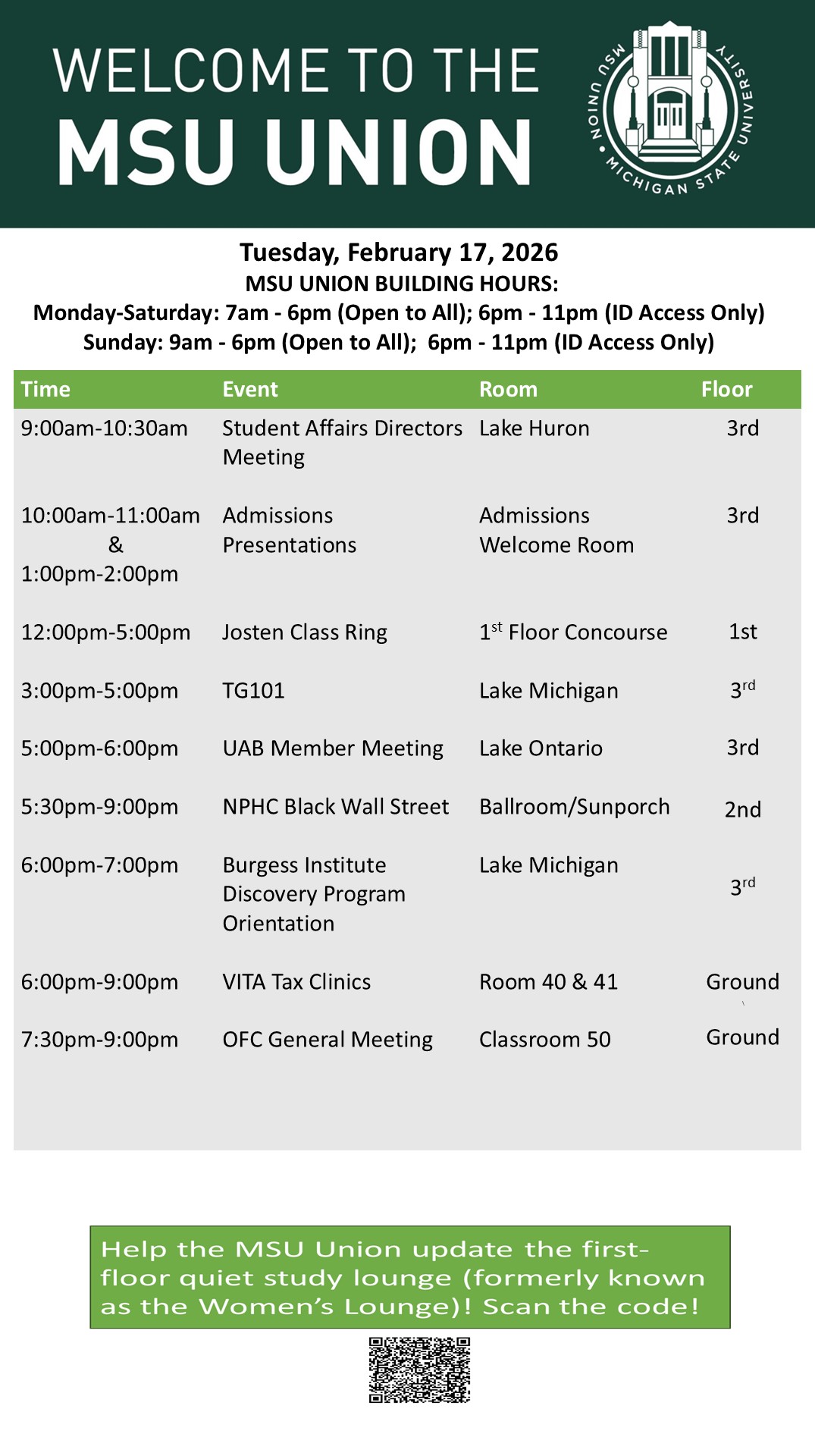By cosme, Tue, 02/17/2026 - 15:24 Creator: cosme Area: MSU Union (Temp Schedule) Type: Academic Title: 02/17/26 Subheader: Body Copy: Active Dates: Tue, 02/17/2026 - 04:30 - Tue, 02/17/2026 - 23:59 Preview