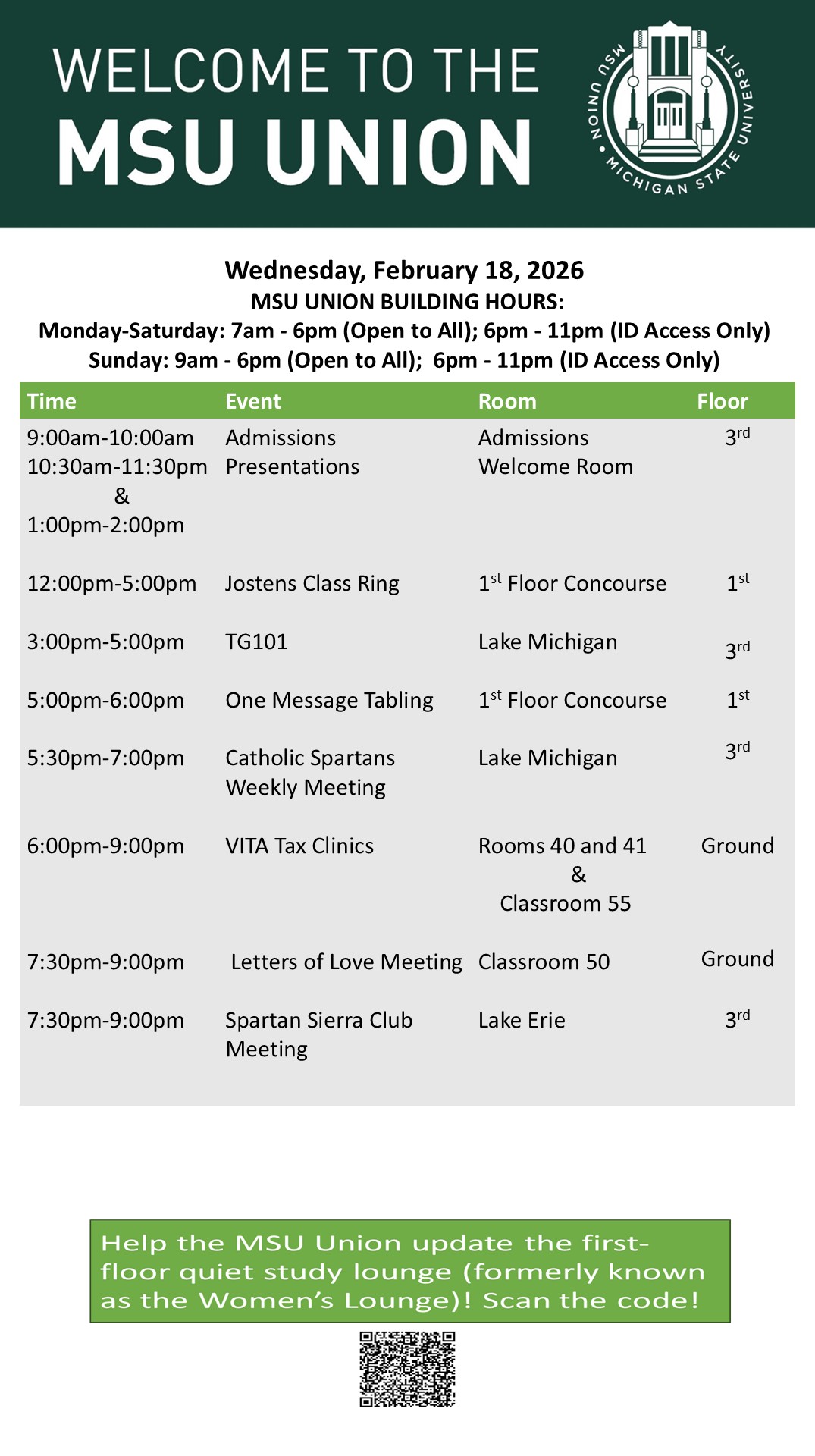 By cosme, Tue, 02/17/2026 - 15:26 Creator: cosme Area: MSU Union (Temp Schedule) Type: Academic Title: 02/18/26 Subheader: Body Copy: Active Dates: Wed, 02/18/2026 - 03:43 - Wed, 02/18/2026 - 23:59 Preview