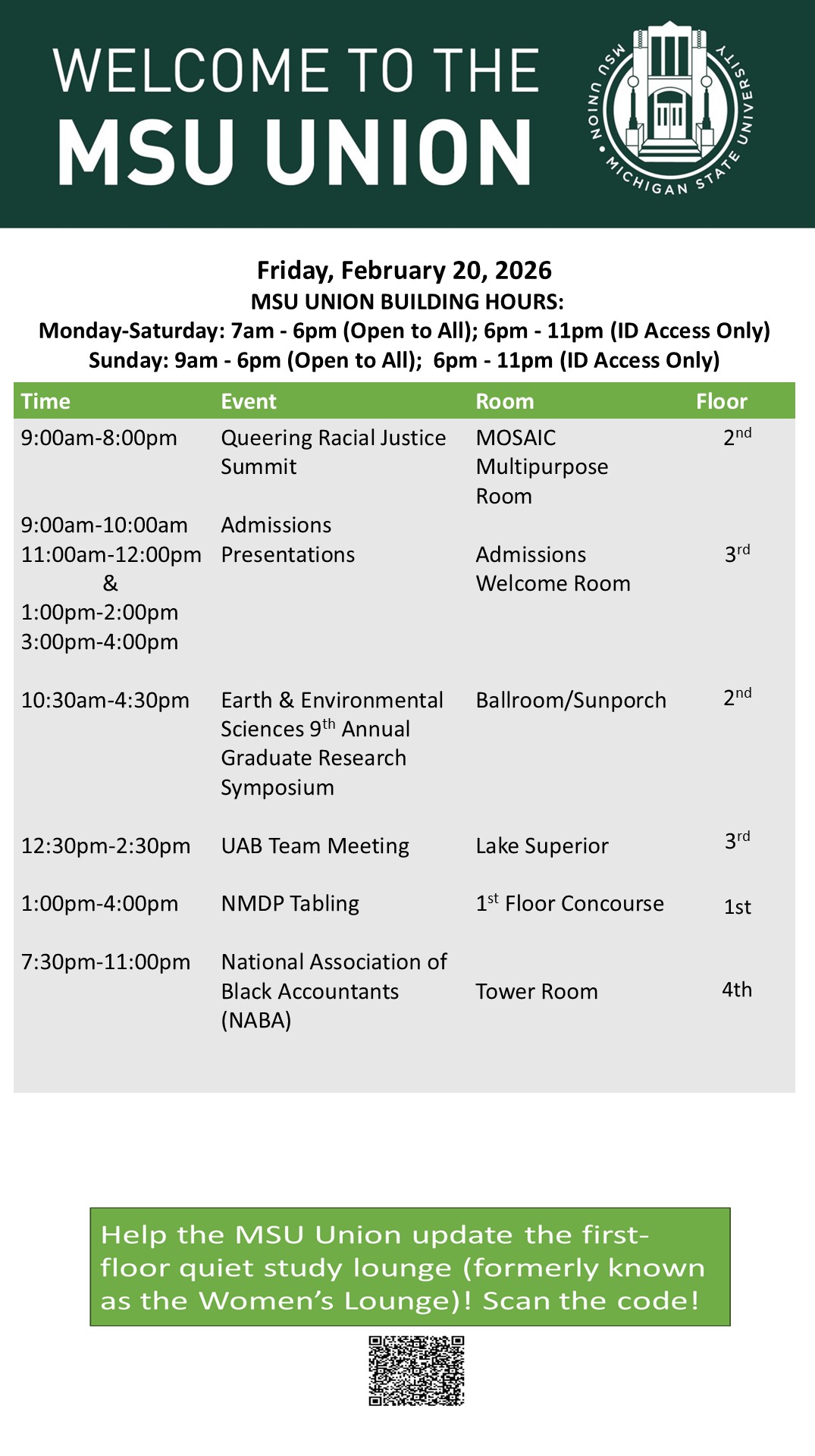 By cosme, Tue, 02/17/2026 - 16:05 Creator: cosme Area: MSU Union (Temp Schedule) Type: Academic Title: 02/20/26 Subheader: Body Copy: Active Dates: Fri, 02/20/2026 - 04:30 - Fri, 02/20/2026 - 23:59 Preview