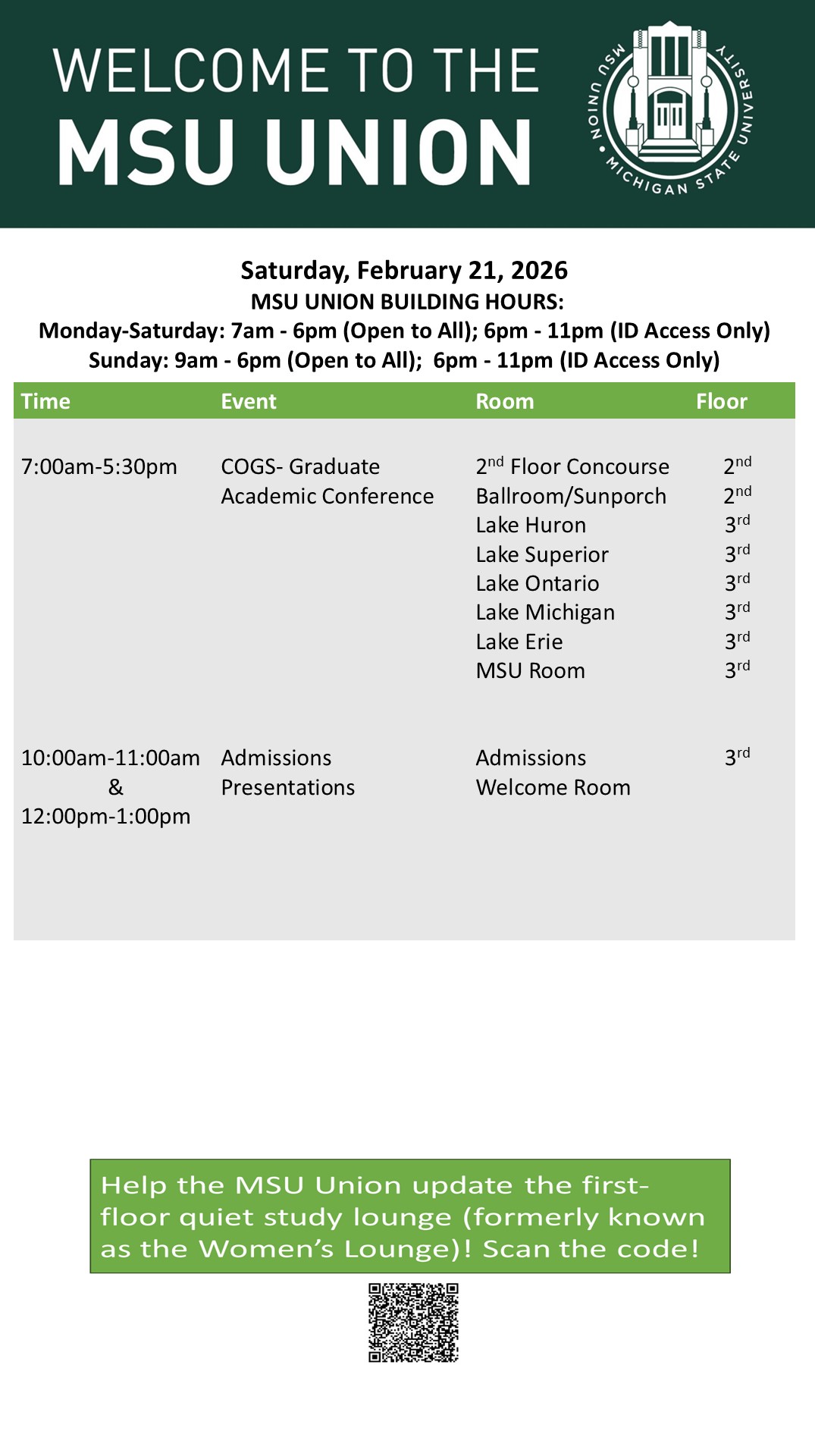 By cosme, Tue, 02/17/2026 - 16:20 Creator: cosme Area: MSU Union (Temp Schedule) Type: Academic Title: 02/21/26 Subheader: Body Copy: Active Dates: Sat, 02/21/2026 - 04:30 - Sat, 02/21/2026 - 23:59 Preview