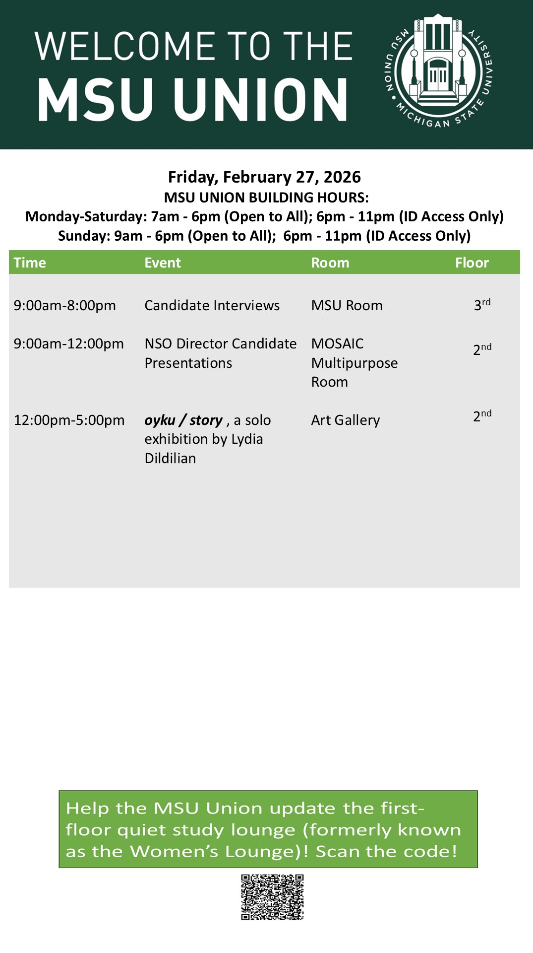 By cosme, Fri, 02/27/2026 - 12:59 Creator: cosme Area: MSU Union (Temp Schedule) Type: Academic Title: 02/27/26 Subheader: Body Copy: Active Dates: Fri, 02/27/2026 - 04:30 - Fri, 02/27/2026 - 23:59 Preview