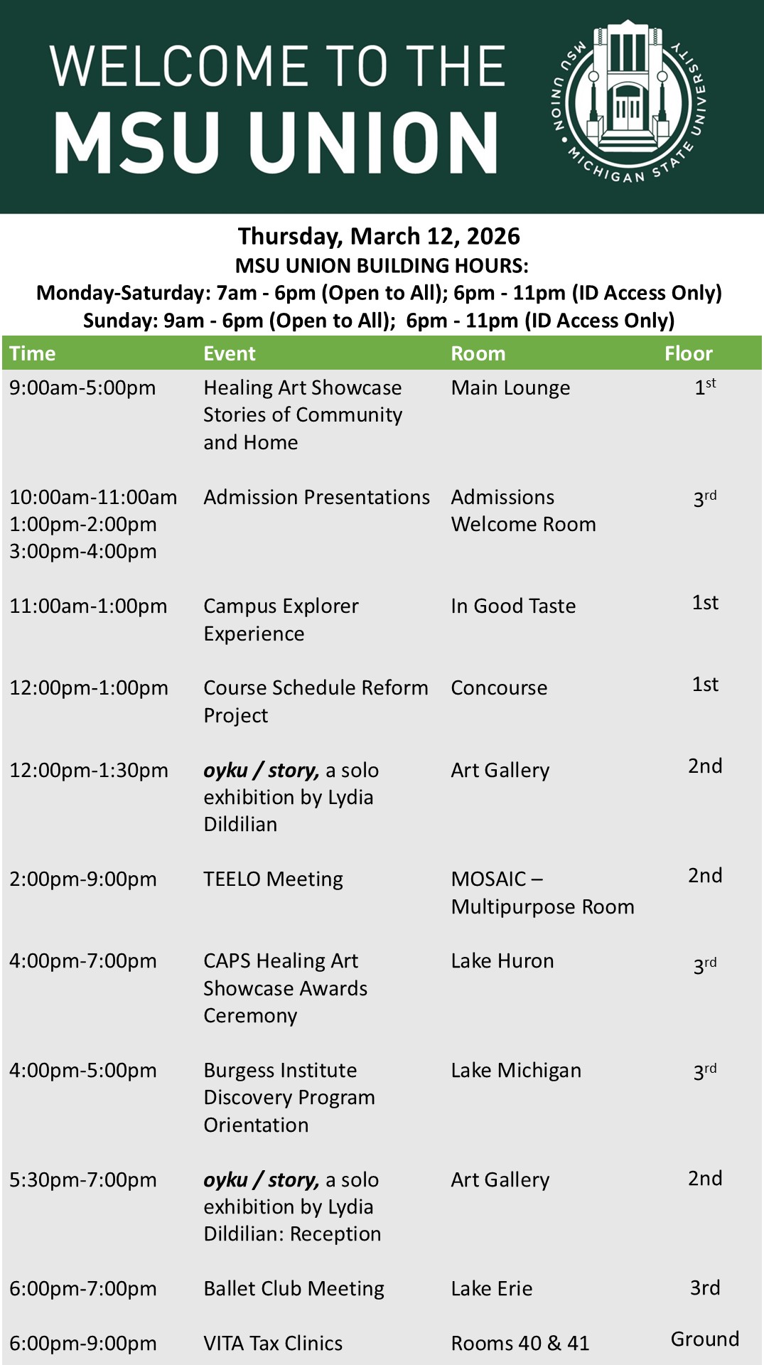 By cosme, Mon, 03/09/2026 - 14:40 Creator: cosme Area: MSU Union (Temp Schedule) Type: Academic Title: 03/12/26 Subheader: Body Copy: Active Dates: Thu, 03/12/2026 - 04:30 - Thu, 03/12/2026 - 23:59 Preview